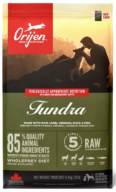 ORIJEN™ Tundra provides your dog with peak nourishment from a variety of unique protein sources. Crafted with an exceptional blend of raw lamb, duck, venison, fish, and more, this recipe is formulated to meet the evolutionary needs of your carnivorous canine. With 85% high-quality animal ingredients, including WholePrey ratios of meat, organs, and bone, ORIJEN Tundra delivers everything your dog needs to thrive, with a delicious taste they’ll love. Making it the perfect choice for a dog who deserves the finest.