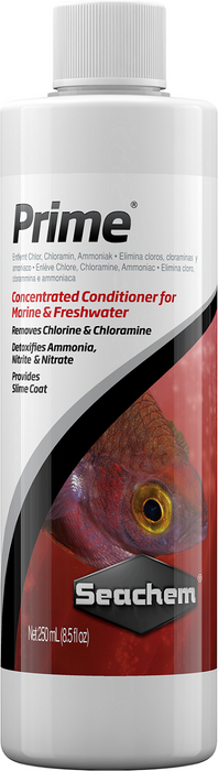 Nearly all pet aquatics companies manufacture a product that removes chlorine. None of those, however, can compare in quality, concentration, or effectiveness to Seachem’s flagship product: Prime®. Prime® is the complete and concentrated conditioner for both fresh and saltwater. Prime® removes chlorine, chloramine and detoxifies ammonia, nitrite, and nitrate. It is non-acidic and will not impact pH. A further bonus for the reef hobbyist—Prime® will not over-activate skimmers.