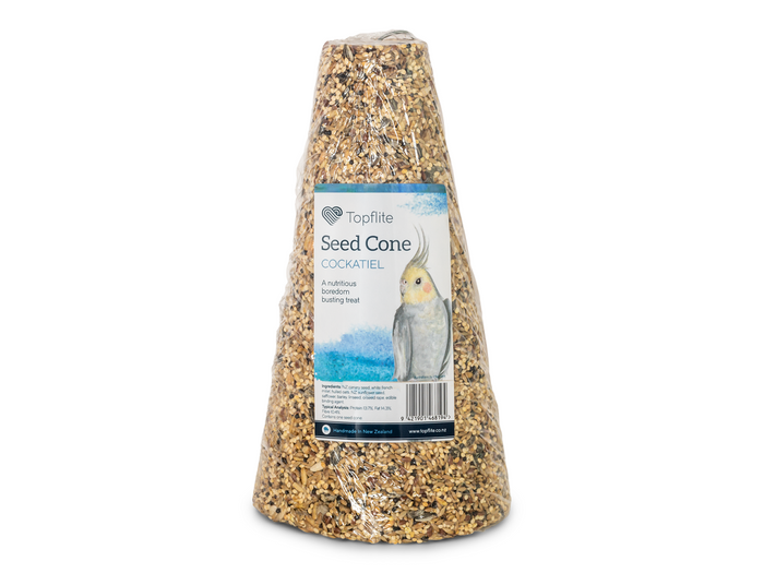 A premium mix of top quality NZ grown cereal and millet seeds are handmade into an easy-to-hang large cone-shaped treat that is highly nutritious and readily available for all hook beaked aviary birds.