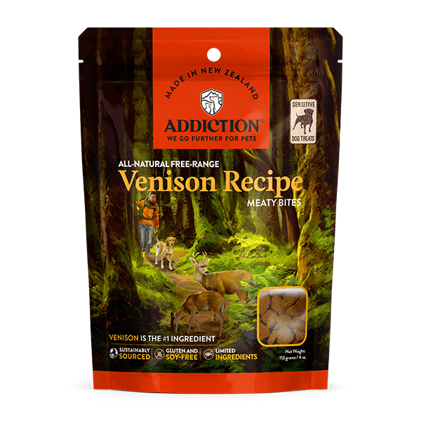 Satisfy your dog’s natural meat craving with Addiction Meaty Bites Venison Recipe. Made with the most succulent, free-range New Zealand Venison as the first ingredient, it’s moist and soft-textured and has a full, rich taste that dogs love. Designed to entice even the pickiest of canines, it’s ideal for complex training or as a reward. Treat your dog to the only healthy treat delicious enough to be called ‘Addiction’.