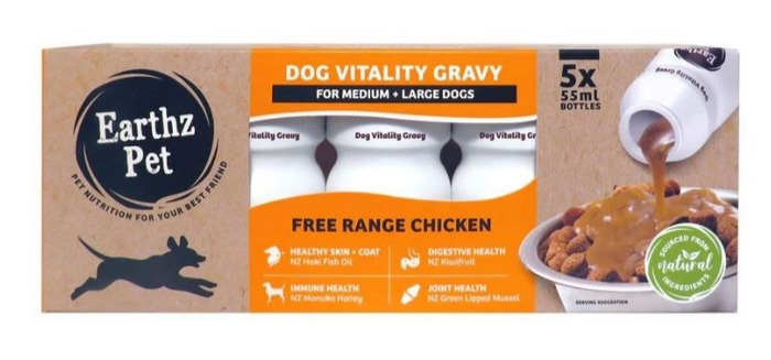 Earthz Pet Dog Vitality Gravy for Medium/Large Dogs in the flavour Free Range Chicken is a pet supplement made with premium New Zealand ingredients including Hoki Fish Oil, Kiwi fruit, Manuka Honey and Green-Lipped Mussel. Each pack comes with 5x50ml bottles in recyclable packaging.