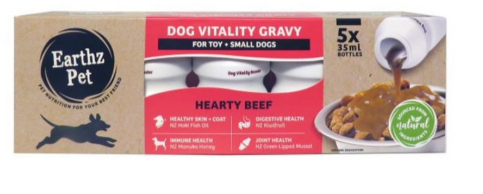 Earthz Pet Dog Vitality Gravy for Toy/Small dogs in the flavour Hearty Beef is a pet supplement made with premium New Zealand ingredients including Hoki Fish Oil, Kiwi fruit, Manuka Honey and Green-Lipped Mussel.