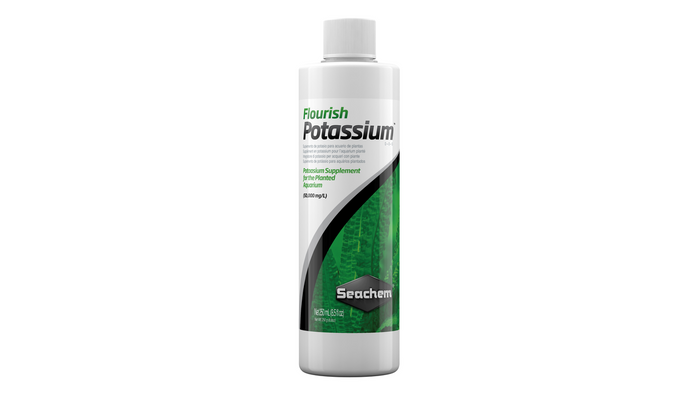 Flourish Potassiumâ„¢ contains 50,000 mg/L of potassium suitable for the natural planted aquarium. Potassium is one of several elements that are vitally important to maintaining a vigorous level of growth in a planted aquarium. Potassium can become depleted in a rapidly growing system or when the source water has a low mineral content. In these cases potassium could become the limiting factor to growth. Use Flourish Potassiumâ„¢ to prevent potassium depletion (signs of which include yellowing in older leaves) and maintain the highest level of growth.