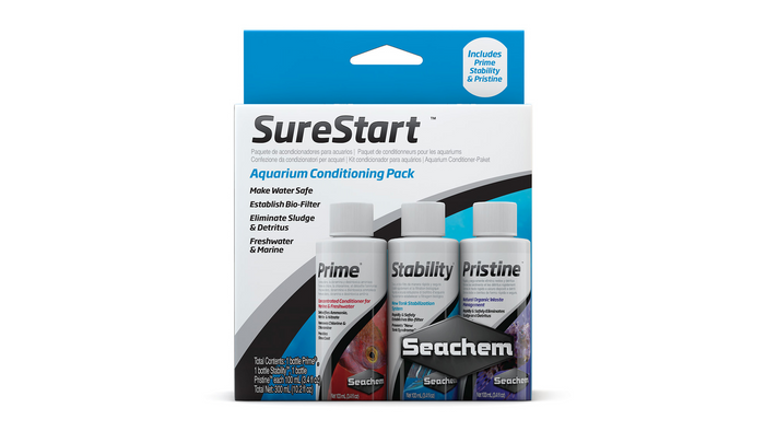 SureStart™ conditioners pack combines 3 of Seachem's top-selling items, Prime®, Stability®, and Pristine™, into one convenient pack. Each plays an important role in initial set-up and maintenance of any aquarium. It’s great for any aquarist but is ideal for the beginner.