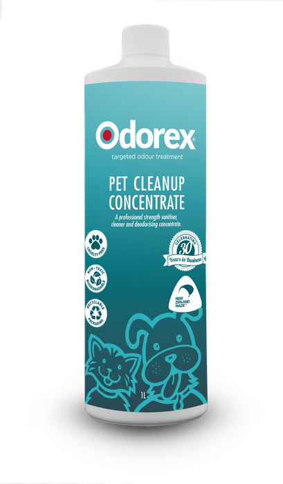 Previously called Odorex Kennel Cleaner Concentrate, Pet Cleanup Concentrate is a professional strength sanitiser, cleaner and deodorising concentrate. It combines deodorising, detergent, antibacterial agents and a pleasant fragrance for the elimination of all animal odour problems caused by urine, faeces etc. Ideal for cages, walls, runs, tables, artificial grass, any large area in kennels, catteries, groomers and doggy daycares.