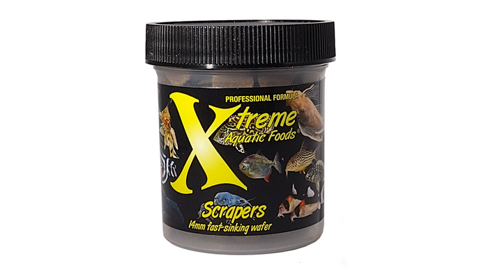 Xtreme Scrapers are one of the most popular Xtreme fish foods. These 13-14mm fast sinking wafers are specially manufactured for catfish, Plecostomus species, and loaches. The wafers sink really fast, so these highly nocturnal and bottom-dwelling species can get straight to the food. The wafers will remain hard in the water for hours, making them ideal for feeding just before you turn the aquarium lights off and allowing nocturnal species to come out and feed.