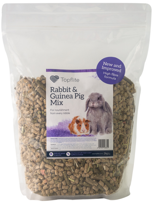 Packed with essential fibre, Topflite Rabbit and Guinea Pig Mix is a tasty complement to a hay-based diet. Features pellets of pressed timothy and lucerne hay for maximum appeal.