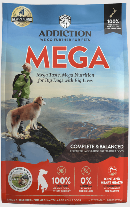 Your dog should be living large, which is why we crafted MEGA, a special formula for big dogs with big lives. MEGA’s savory medley of premium New Zealand free-range Lamb and Beef is blended with fruits and vegetables for maximum nutrition and health. MEGA is also enriched with Glucosamine to support mobility and joint function. It’s rich in antioxidants and phytonutrients to help your dog fight against damage from free radicals and support a healthy and strong immune system. It’s no wonder big dogs around the world love MEGA.