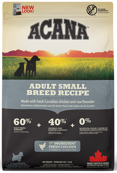 ACANAâ„¢ Adult Small Breed is specially crafted to support the lively lifestyle of smaller dogs with a protein-rich recipe that helps maintain health and vitality. This delicious recipe includes 60% quality animal ingredients, like fresh free-run chicken and raw hake, providing the protein needed to support lean muscle and energy. 40% fresh fruits and vegetables, including pumpkin, leafy greens, and apples, deliver fibre and essential nutrients to support digestion, skin, and coat health.